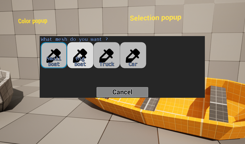 The widget automatically changes its display with its context: Color picker, Selection picker, Exit confirmation, etc. The game communicates only with the scripted object and not the widget itself through code.
